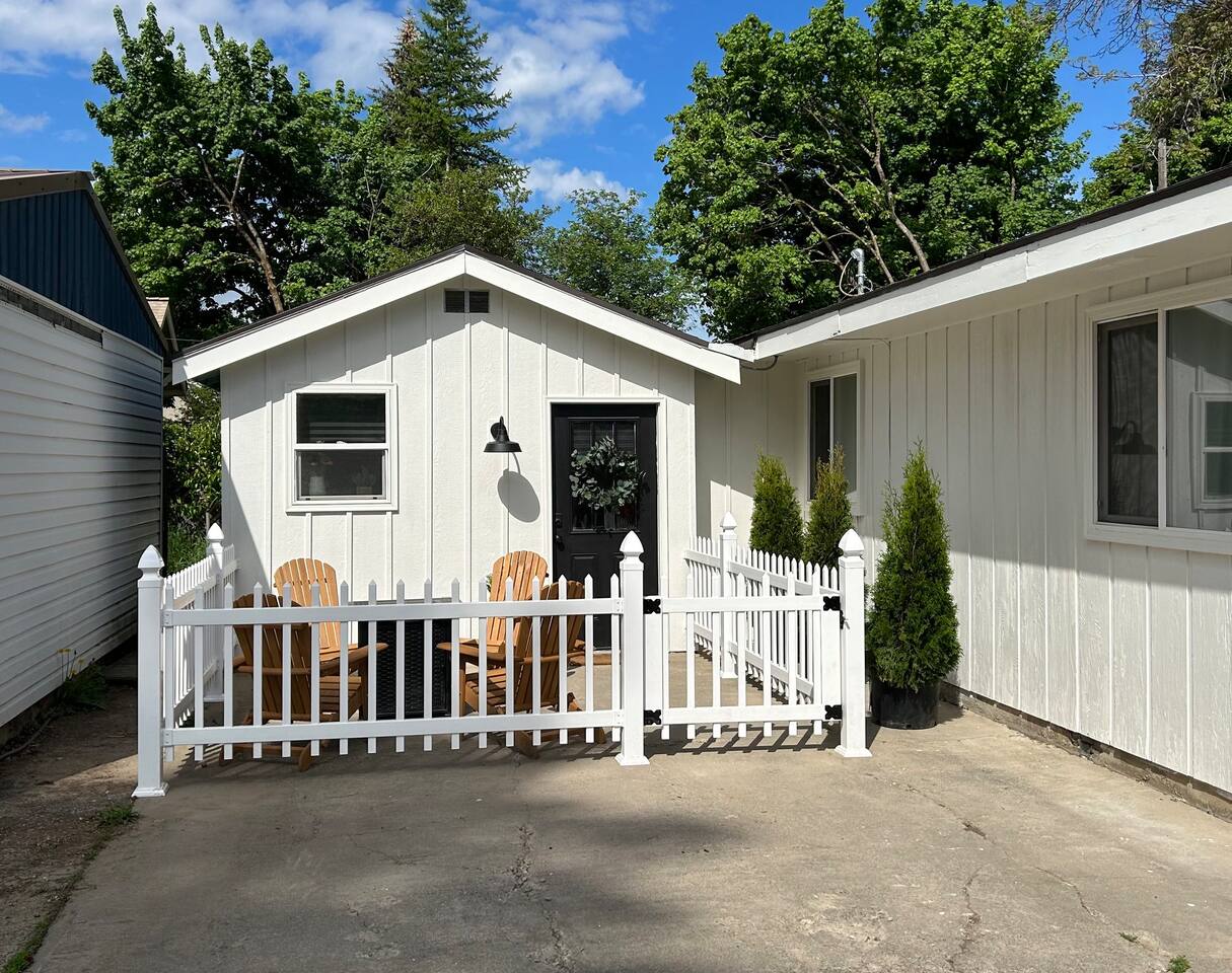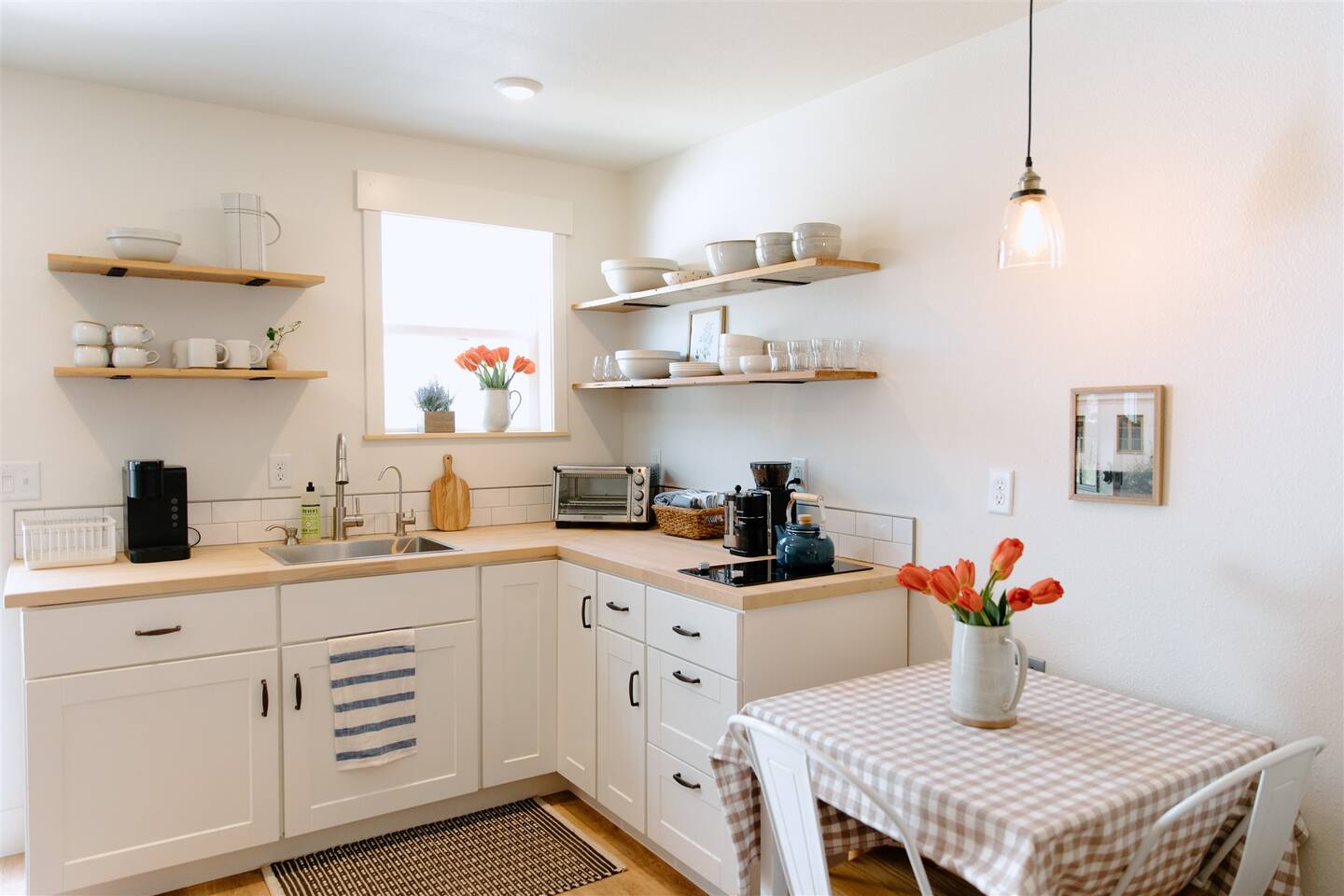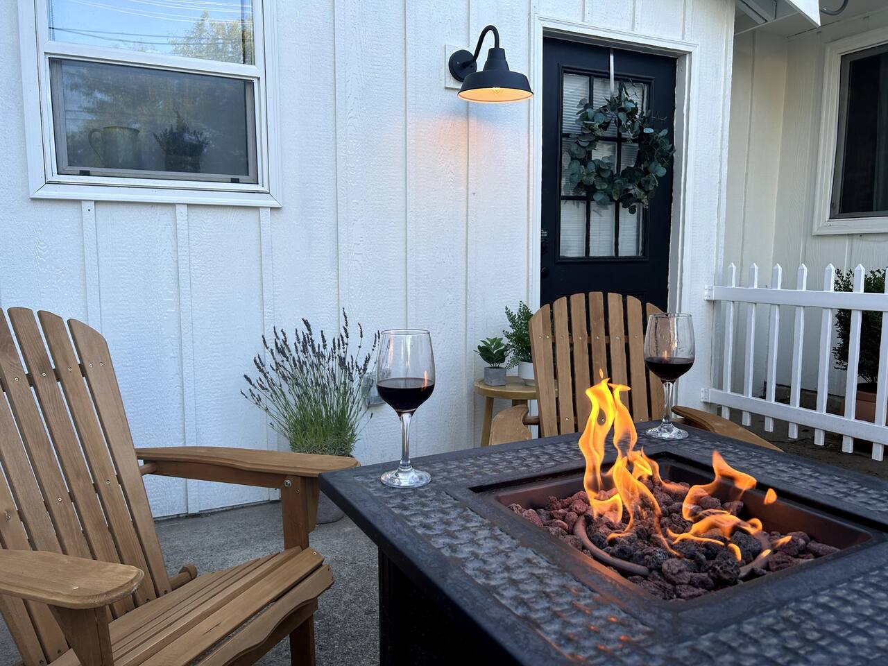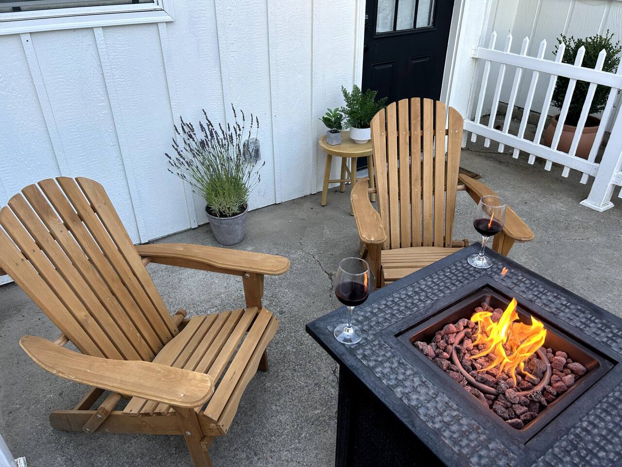 Kitchen: Fully stocked with pots, pans, utensils, knives, plates/platters, and basic spices. You'll have both a Keurig and a French Press (beans and grinder provided), so you'll be sure to have a great cup of coffee each morning :). Filtered water on tap, and a full sink, with a drying rack. You'll also have a toaster oven and a electric stovetop for any cooking. Dining: We have a dining table which seats up to 4 (it seats 2 comfortably in the dining nook, or you can pull it out a few feet and seat a larger group). Salt and pepper provided :) Living Room: Love seat which converts to a twin pull out bed for any extra guests. 43 inch smart TV on a pivot arm (so you can pull it out to face the bed if you'd like), with a great sound bar. You can use netflix, or connect any of your other streaming services! Bedroom: King sized bed, charging dock provided on a bedside table for all of your devices. Bathroom/Laundry: Fully stocked bathroom with a stack washer/dryer for all of your laundry needs. Outdoor Patio: Fenced in patio area with four Adirondack chairs (or you and your friends :). You'll also have a propane firepit - you can leave the cover on the firepit and it also functions as a table.