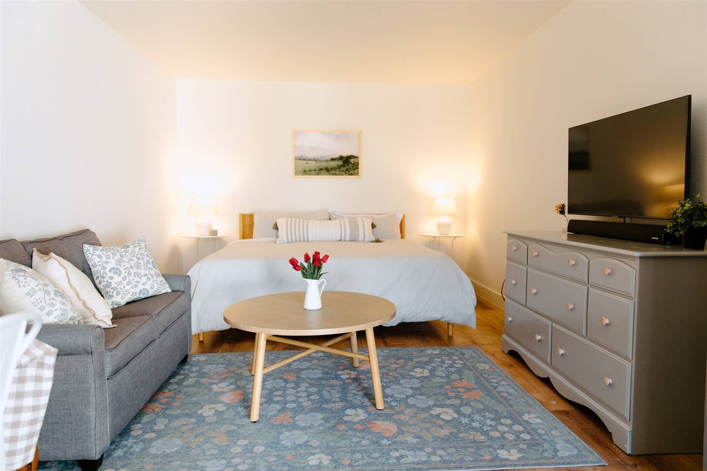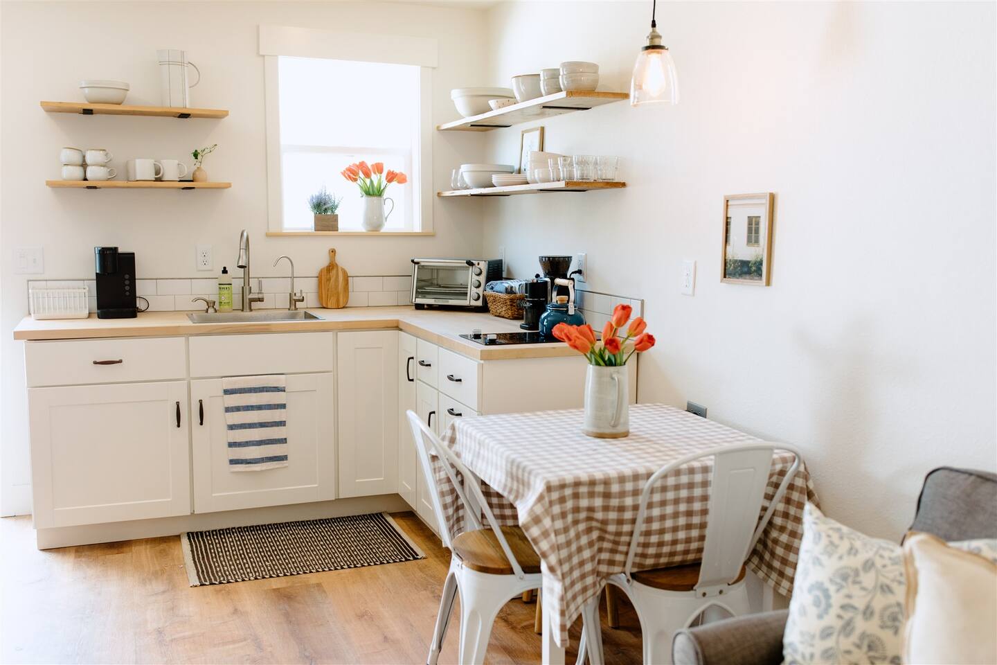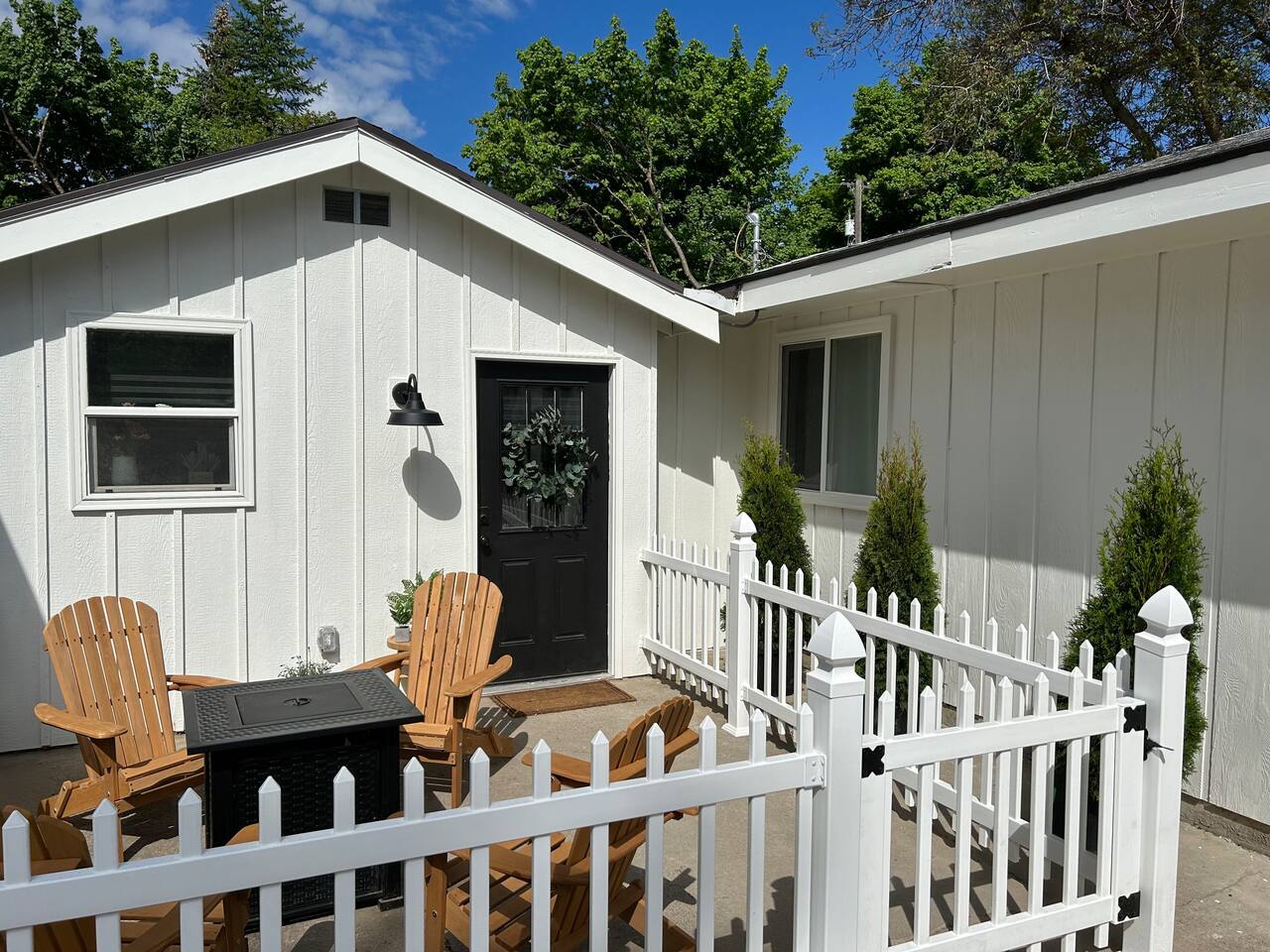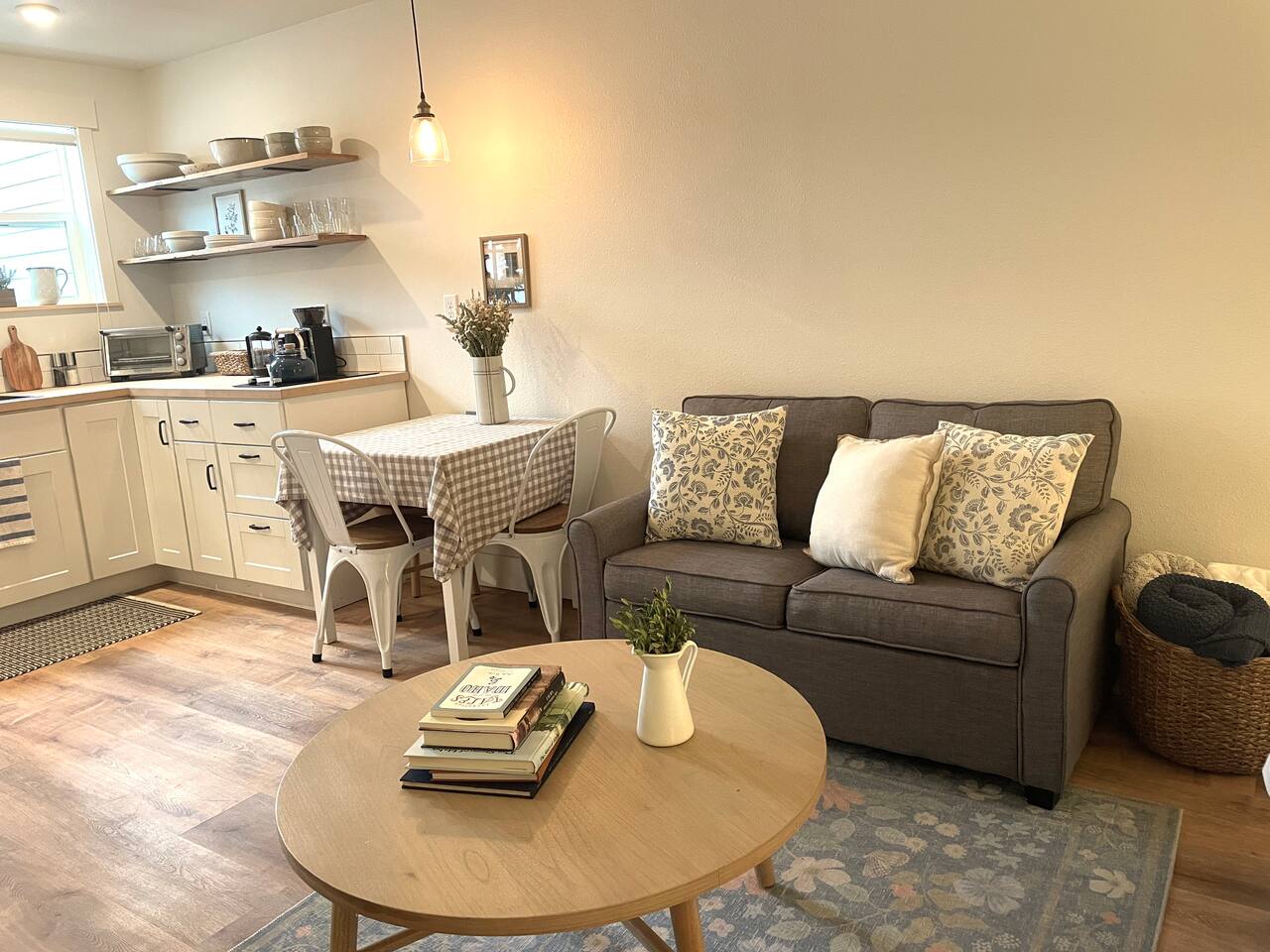 Kitchen: Fully stocked with pots, pans, utensils, knives, plates/platters, and basic spices. You'll have both a Keurig and a French Press (beans and grinder provided), so you'll be sure to have a great cup of coffee each morning :). Filtered water on tap, and a full sink, with a drying rack. You'll also have a toaster oven and a electric stovetop for any cooking. Dining: We have a dining table which seats up to 4 (it seats 2 comfortably in the dining nook, or you can pull it out a few feet and seat a larger group). Salt and pepper provided :) Living Room: Love seat which converts to a twin pull out bed for any extra guests. 43 inch smart TV on a pivot arm (so you can pull it out to face the bed if you'd like), with a great sound bar. You can use netflix, or connect any of your other streaming services! Bedroom: King sized bed, charging dock provided on a bedside table for all of your devices. Bathroom/Laundry: Fully stocked bathroom with a stack washer/dryer for all of your laundry needs. Outdoor Patio: Fenced in patio area with four Adirondack chairs (or you and your friends :). You'll also have a propane firepit - you can leave the cover on the firepit and it also functions as a table.
