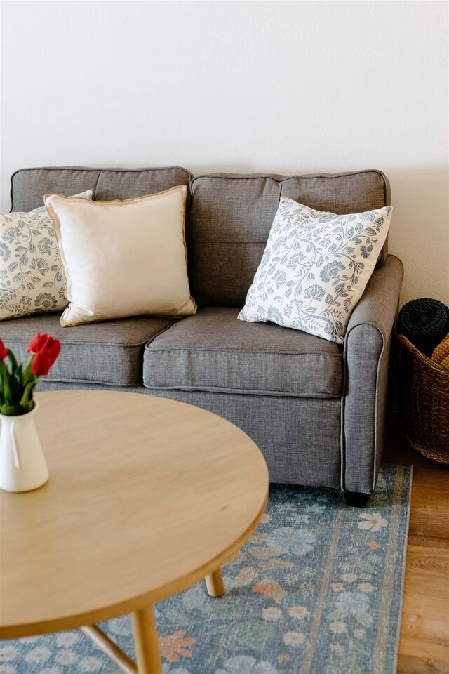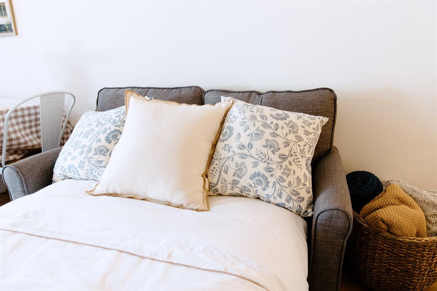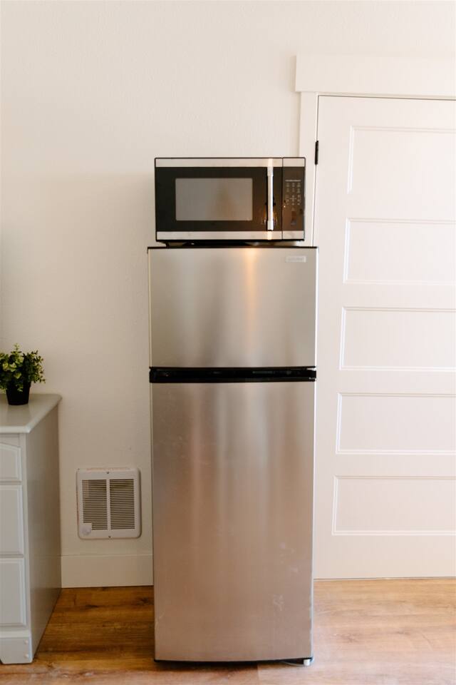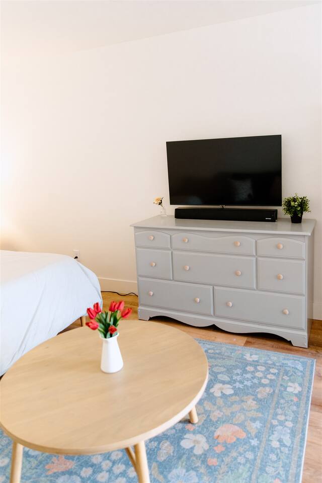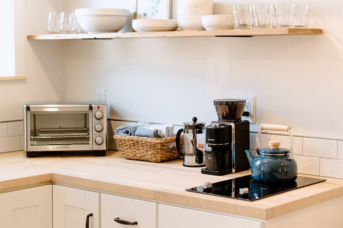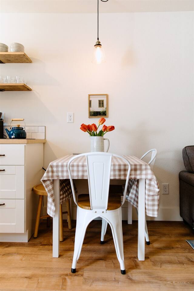 Kitchen: Fully stocked with pots, pans, utensils, knives, plates/platters, and basic spices. You'll have both a Keurig and a French Press (beans and grinder provided), so you'll be sure to have a great cup of coffee each morning :). Filtered water on tap, and a full sink, with a drying rack. You'll also have a toaster oven and a electric stovetop for any cooking. Dining: We have a dining table which seats up to 4 (it seats 2 comfortably in the dining nook, or you can pull it out a few feet and seat a larger group). Salt and pepper provided :) Living Room: Love seat which converts to a twin pull out bed for any extra guests. 43 inch smart TV on a pivot arm (so you can pull it out to face the bed if you'd like), with a great sound bar. You can use netflix, or connect any of your other streaming services! Bedroom: King sized bed, charging dock provided on a bedside table for all of your devices. Bathroom/Laundry: Fully stocked bathroom with a stack washer/dryer for all of your laundry needs. Outdoor Patio: Fenced in patio area with four Adirondack chairs (or you and your friends :). You'll also have a propane firepit - you can leave the cover on the firepit and it also functions as a table.
